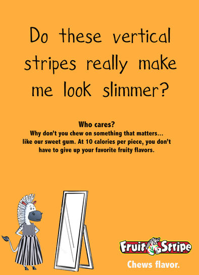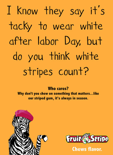 Woah, bet you haven't heard that name in years. When I was tasked with creating a print ad series for this unique client, my creative approach stemmed from the fact that we like to ask these big questions (particularly about stripes) that seem to matter so much, but in the end no one really cares. So, instead of wasting time stroking our beards, squinting our foreheads, and taking our glasses on and off to analyze these useless questions, we exclaim “Who cares,” there are more important things to chew on, like Fruit Stripe for God’s sake.